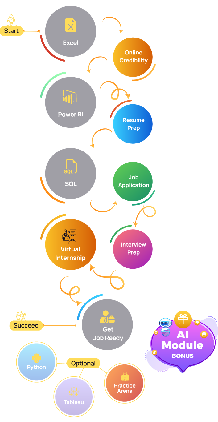 “In our Virtual Internship, you’ll gain practical experience in data analytics using PowerBI, SQL, Excel, and Python. You’ll learn Scrum project management, improve debugging skills, and master data cleaning and transformation. Understanding requirements and presenting complex analysis concisely are key focuses.”